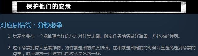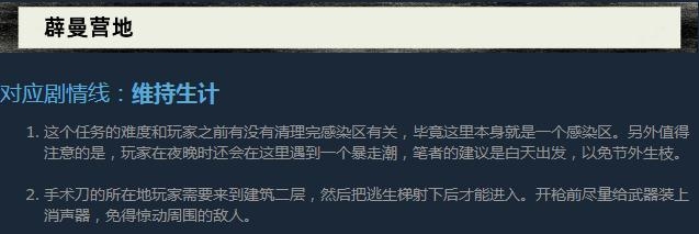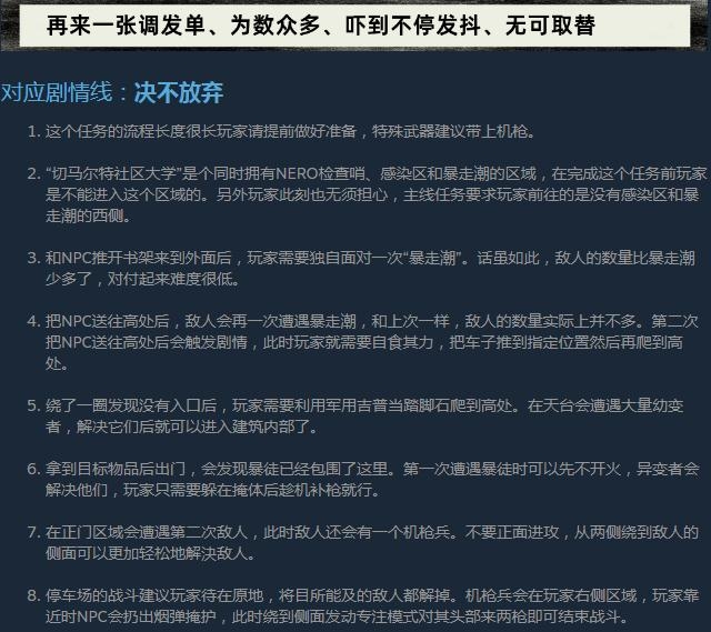 3.关于清理感染区,本作的感染区在白天和夜晚是不同的,白天敌人数量更多但动作较慢,夜敌人更少但攻击性更强。话虽如此,笔者还是推荐在夜晚的时候下手,可以相对减少一些麻烦。当然,这需要具体情况具体分析,如果感染区附近有暴走潮的话,在暴走潮不会外出的白天行动会安全很多。