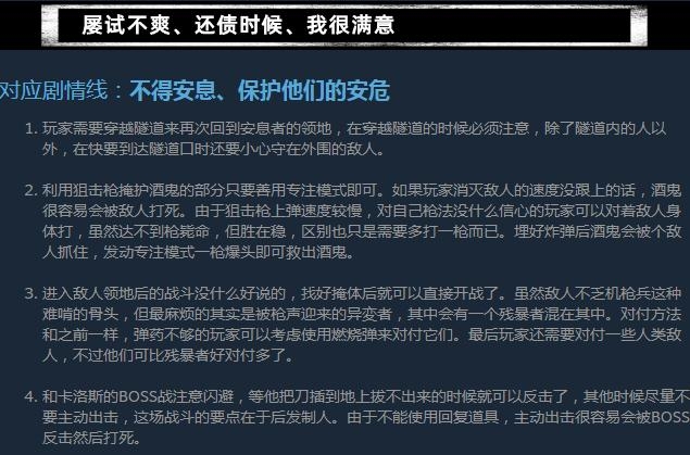 3.要想进入修车店,玩家需要先从箱子爬到顶层,再从顶层跳下。找到零件后玩家会第一次遇到人类敌人“安息者”,攻击的时候小心别把酒鬼给杀了。