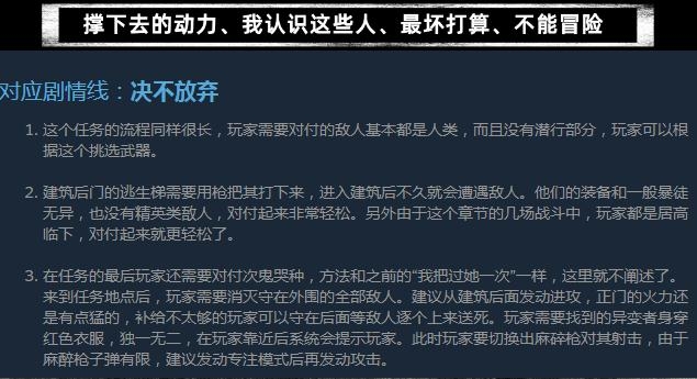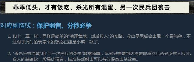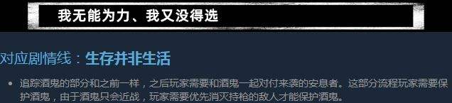 将酒鬼送到安全屋后,玩家需要对付一群浪迹者。作为本作的第一次扫荡营地,难度不高。入口处的两个敌人会在聊天结束后分开,此时玩家就可以分开击破了。进入营地后还有四个敌人,而这四个敌人本身站位就离得很远,而且视线互不重叠,解决起来还是非常简单的。