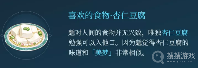 魈对人间的食物并非无兴趣,唯独杏仁豆腐勉强可以入他扣。因为魈觉得杏仁豆腐的味道和美梦非常相似。