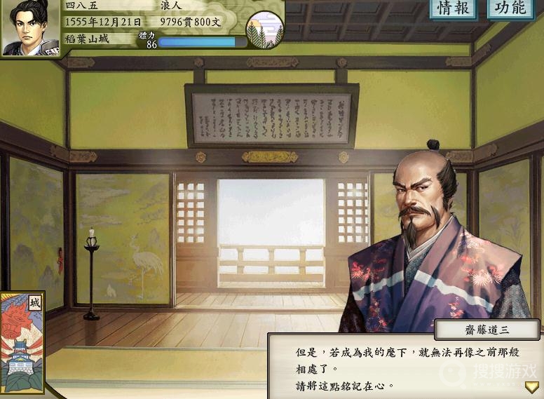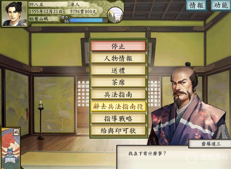 比如说主角以浪人身份成为斋藤道三的兵法指南,然后玩家选择辞去兵法指南。需要注意的是这里一定要是浪人兵法指南,武将兵法指南等于武将身份。