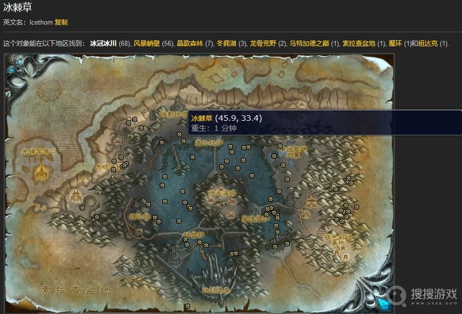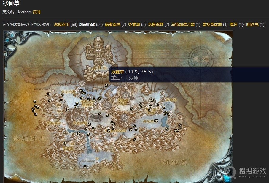 风暴峭壁地图拥有56个冰棘草的采集点,主要分布在该地图的雪流平原、冰霜堡和丹尼芬雷区域,部分采集点会与其他药材重合。