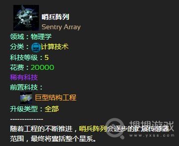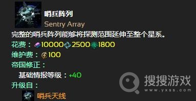 3.在工程船完成建造后,该星系会出现1个“哨兵阵列基址”。“哨兵阵列基址”无法使用,需要同样支付大量合金将其升级为“哨兵天线”、“哨兵中心”和“哨兵阵列”。