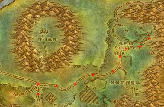 在乘坐飞艇到达荆棘谷的格罗姆高营地以后,沿着地图上的线路向北走,进入暮色森林。