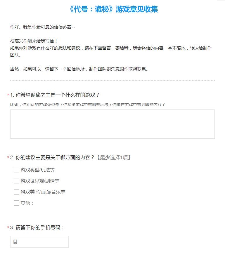 玩家进入该网址后可以在此处填写自己对《代号:诡秘》的游戏期望并留下手机号码,向制作团队提供有用的建议。