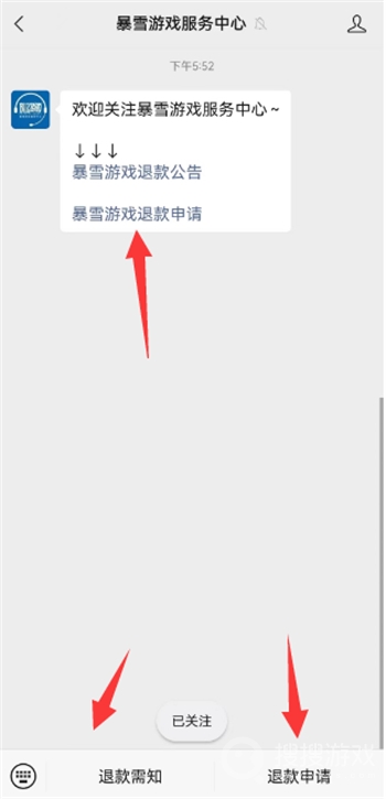 2、进入聊天页面,公众号会发送申请退款公告和申请退款入口。