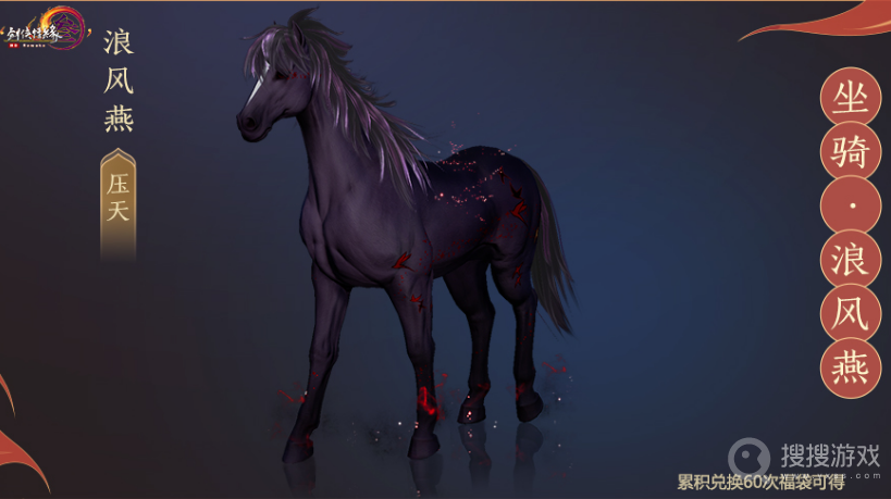 累积开启60个福袋可额外赠送定制坐骑【浪飞燕·压天】。