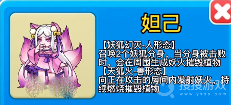 [妖狐幻灭-人形态]召唤2个妖狐分身,当分身被击败时,会在周围生成妖火摧毁植物
