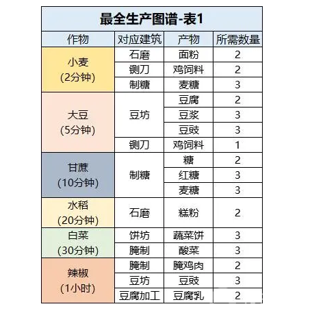 虽然因为等级限制有些还没解锁的就没写进来,但这对于新手理清思路已经足够了,毕竟最基础的作物和建筑就那几个,大家可以结合这三个表来看看自己的经营重点。