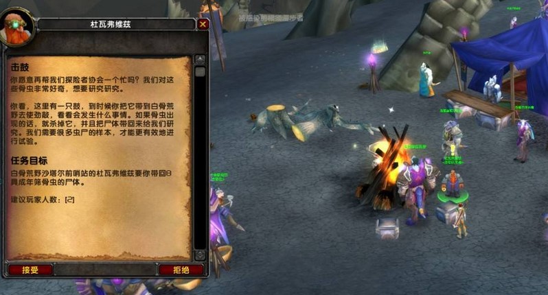 在游戏中,击鼓任务的完成方法是接受任务后,到营地外的白骨荒野使用虫鼓,就是任务给的那个鼓。