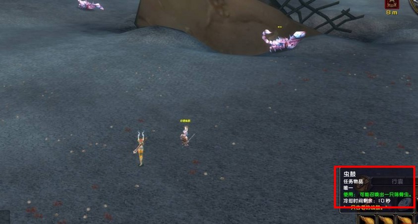 推荐玩家走到营地外面一定就好,原因是使用虫鼓只是概率召唤出成年筛骨虫,有一定的概率会召唤出矮人。召唤出来的矮人会攻击玩家,且玩家击杀矮人不会获得经验,也不会掉落奖励。召唤出矮人之后,跑到NPC旁边,让NPC把矮人击杀即可。