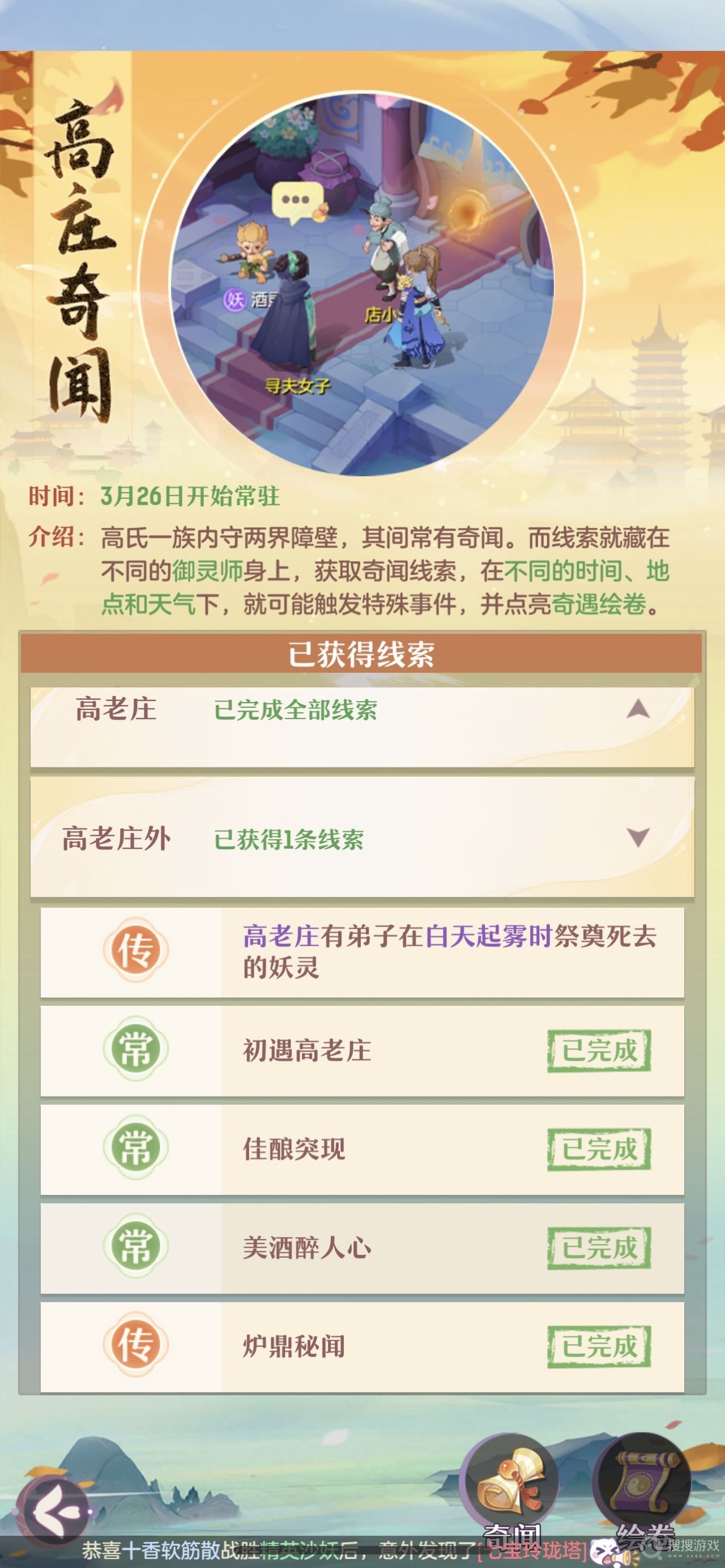 1、【高老庄有弟子在白天起雾时祭奠死去的妖灵】这个奇遇是限时的,你必须在现实时间的白天(大概是早8到晚6,正好是上班时间所以我碰不到)去高老庄才能遇见