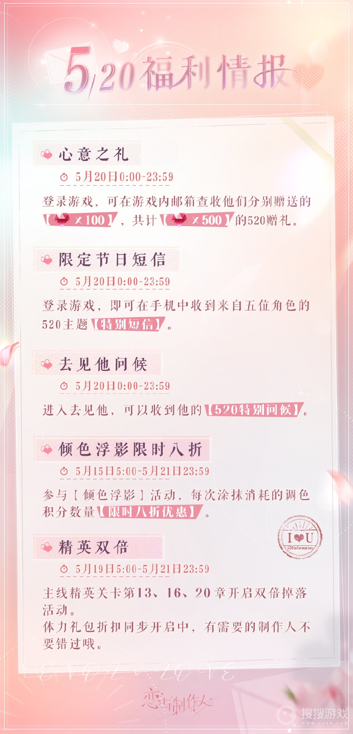 近日有一款游戏因其独特的玩法吸引了非常多的玩家,这款游戏就是恋与制作人。虽然这款游戏玩法十分好玩,但是游戏中的一个问题却一直困扰着玩家们,那就是《恋与制作人》520活动福利一览。如果你想知道这个问题的解决方法,那么下面就跟随搜搜游戏小编一起来学习一下吧。
