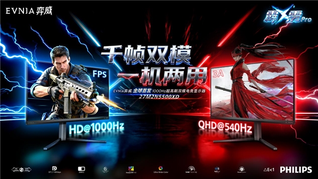 千帧双模,一机两用!EVNIA弈威1000Hz超高刷双模电竞显示器27M2N5500XD,尽显千帧硬实力!新品于1月4日正式开售,敬请锁定飞利浦显示器京东自营旗舰店,国补&其他优惠政策可咨询店铺客服!