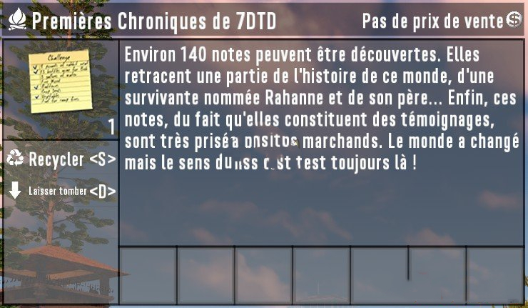 《七日杀》7DTD编年史MOD,是一款和剧情相关的游戏mod,能够在游戏里添加超过140个世界编年史便签,主要包含了游戏剧情的解析和幸存者的故事总结,不过只有英文版本,感兴趣的小伙伴就来下载吧。