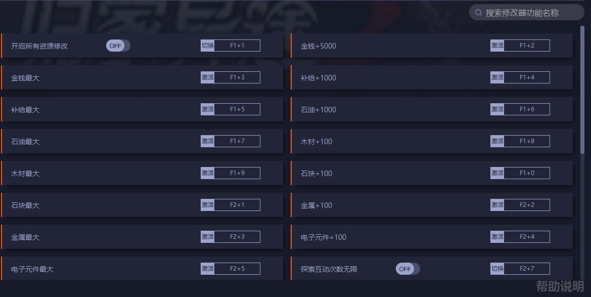 1.开启所有资源修改:进入游戏场景后开启。